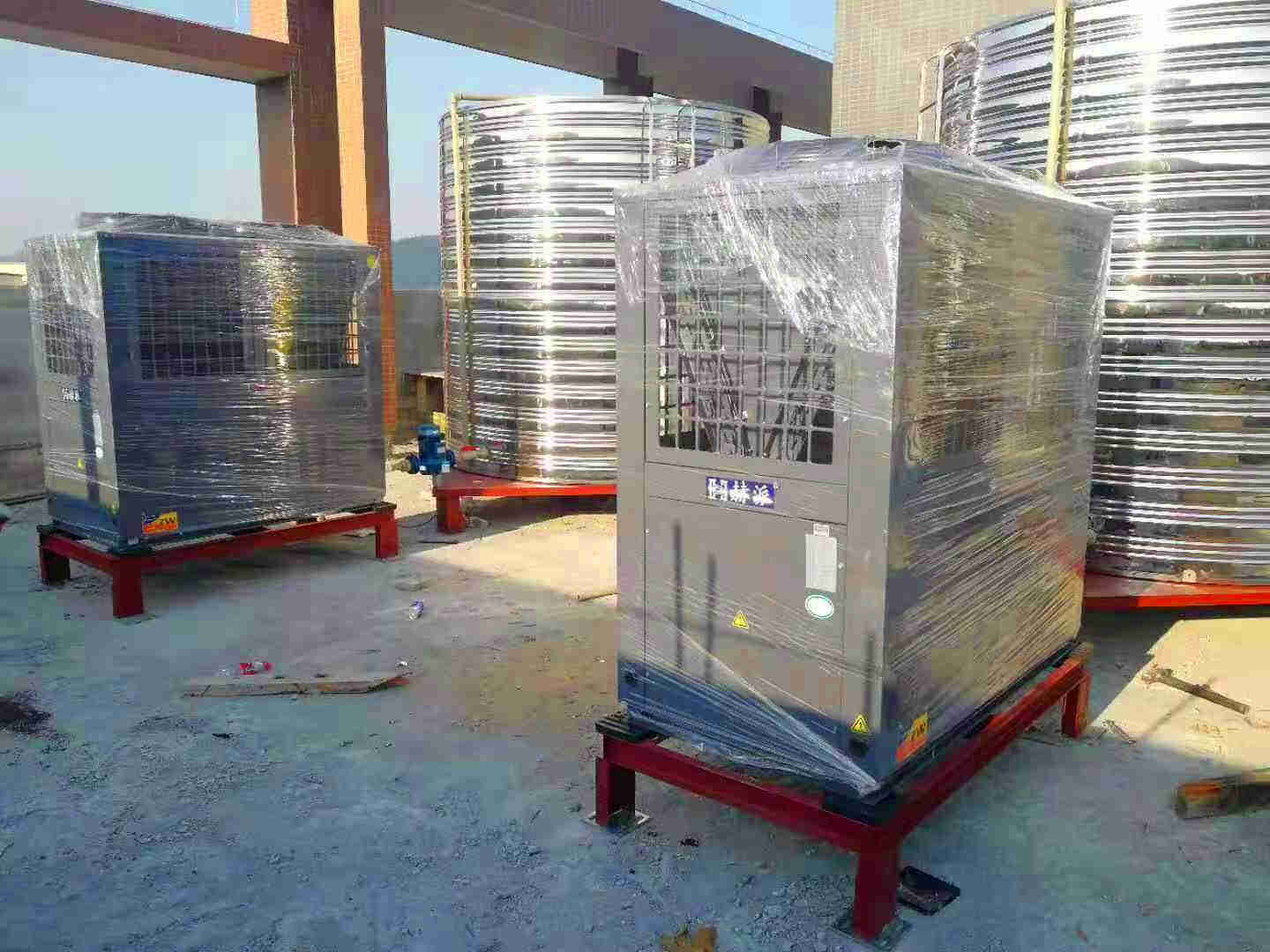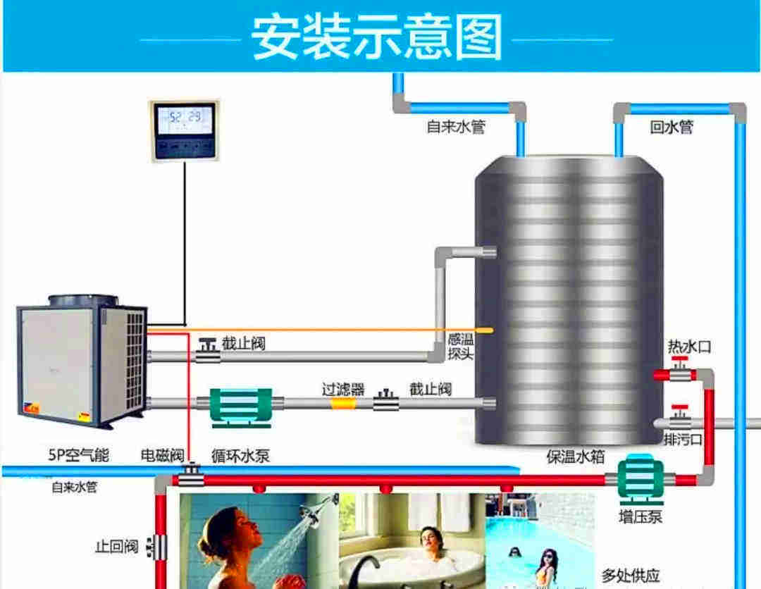 在標況下系統設計為自來水流經機組一次升溫5℃。將保溫水箱中的水循環加熱至設定溫度。系統設計簡單,在天氣比較寒冷區域,機組能穩定運行。